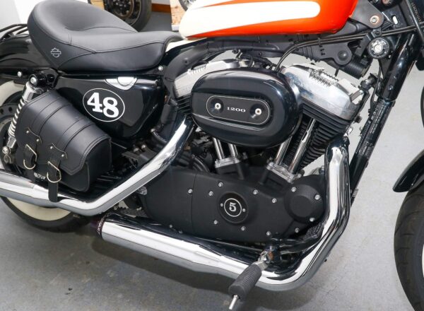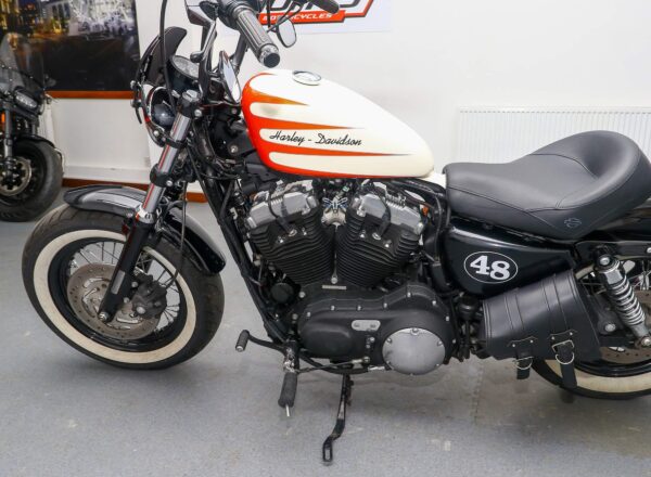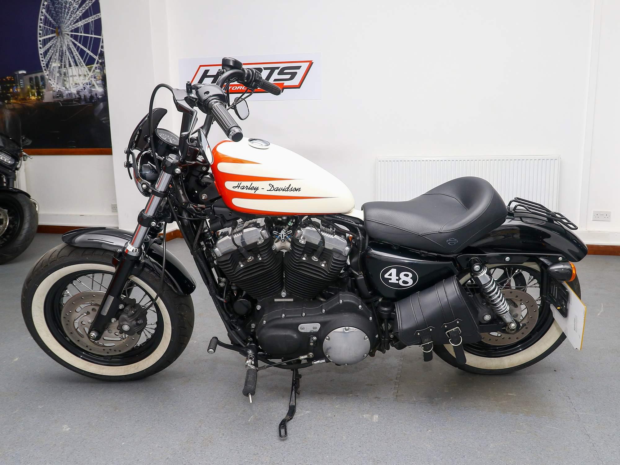 2013, ’13 reg. Harley-Davidson XL1200 Forty Eight. Complete with custom painted fuel tank, custom seat, leather saddle bags, tinted flyscreen, white wall tyres, luggage rack and Rinehart Short Shot pipes. Looks, sounds and rides superb. Great value at £7,995. PLUS : WE’LL DELIVER TO YOUR DOOR ANYWHERE IN MAINLAND UK FOR JUST £99! – Part-Ex and finance/PCP available, please ask for details. Call Hunts Motorcycles on 0161-432 1303. Please note: Some of our stock is stored off-site so please call us before setting off to view any of our pre-owned bikes.