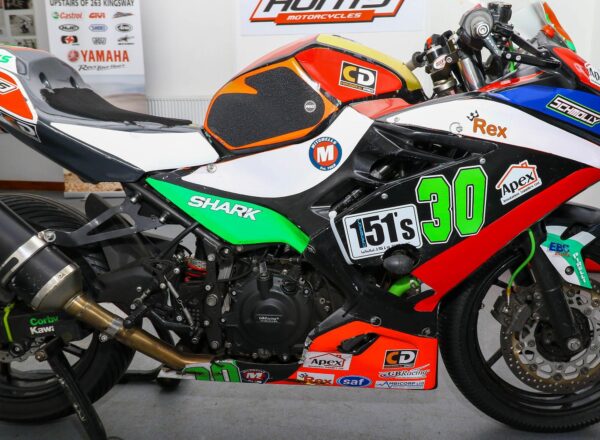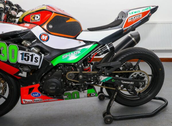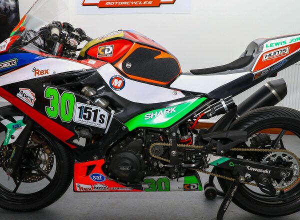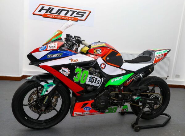 Kawasaki Ninja 400 BEMSEE Team Green Junior Cup race/track bike. Ex-Lewis Jones race winning bike. Complete with spare wheels, bodywork and HM quickshifter. Ready to race and great value at £5,295. PLUS : WE’LL DELIVER TO YOUR DOOR ANYWHERE IN MAINLAND UK FOR JUST £99! – Call Hunts Motorcycles on 0161-432 1303. Please note: Some of our stock is stored off-site so please call us before setting off to view any of our pre-owned bikes.