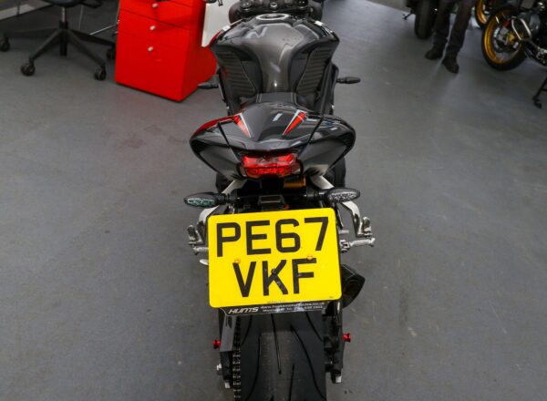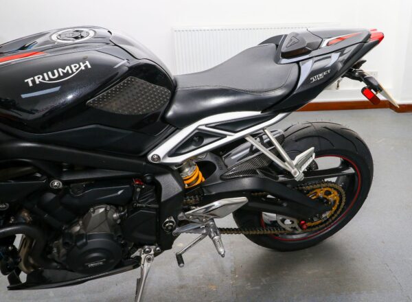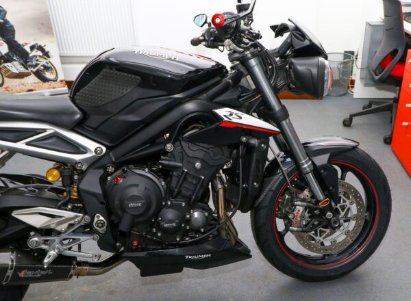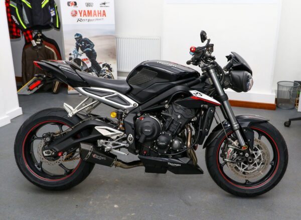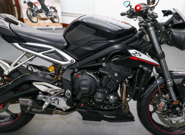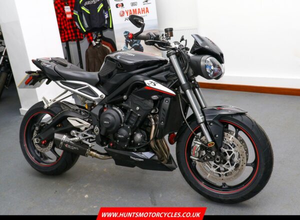 2018, ’67 reg. Triumph Street Triple 765 RS. Just one former owner and complete with GB Racing engine case covers, carbon hugger, belly pan, rim tapes, tail tidy, bar end mirrors, tank grips, quickshifter, anodised oil filler cap and bar ends, radiator guard, flyscreen, stainless brake hoses plus Lextek exhaust system. Suspension set up by K-Tech and two new tyres just fitted. Looks, sounds and rides superb. Fantastic value at just £5,795. PLUS : WE’LL DELIVER TO YOUR DOOR ANYWHERE IN MAINLAND UK FOR JUST £99! – Part-Ex and finance/PCP available, please ask for details. Call Hunts Motorcycles on 0161-432 1303. Please note: Some of our stock is stored off-site so please call us before setting off to view any of our pre-owned bikes.