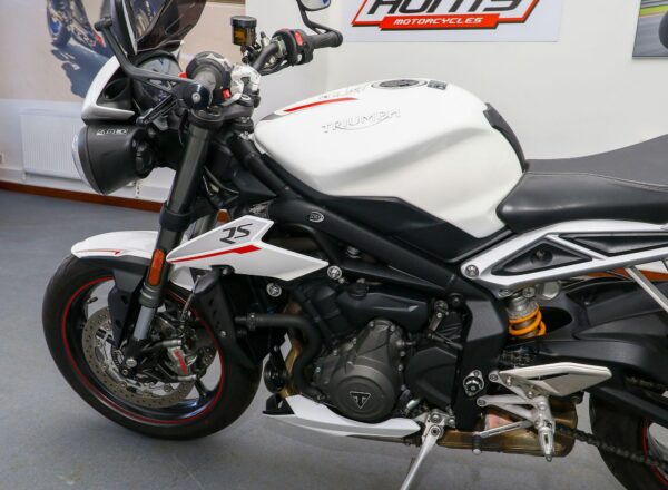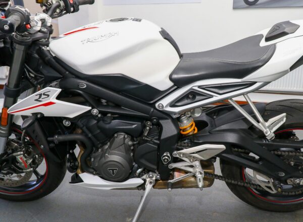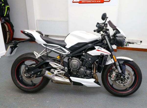 2019, ’19 reg. Triumph Street Triple 765 RS. One owner and just 6,942 miles from new. Complete with Öhlins shock, Brembo brakes, seat cowl, bar end mirrors, tinted flyscreen, rim tapes, paddock stand bobbins and Arrow pipe. Looks, sounds and rides great. Superb value at £6,795. PLUS : WE’LL DELIVER TO YOUR DOOR ANYWHERE IN MAINLAND UK FOR JUST £99! – Part-Ex and finance/PCP available, please ask for details. Call Hunts Motorcycles on 0161-432 1303. Please note: Some of our stock is stored off-site so please call us before setting off to view any of our pre-owned bikes.