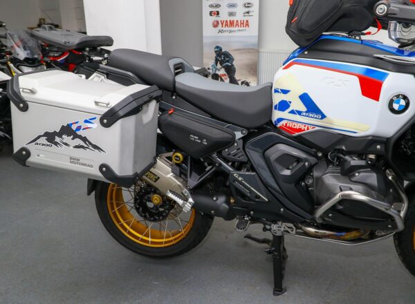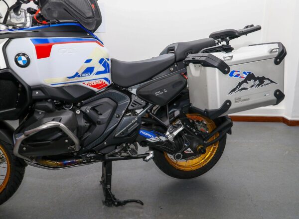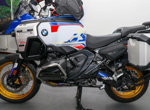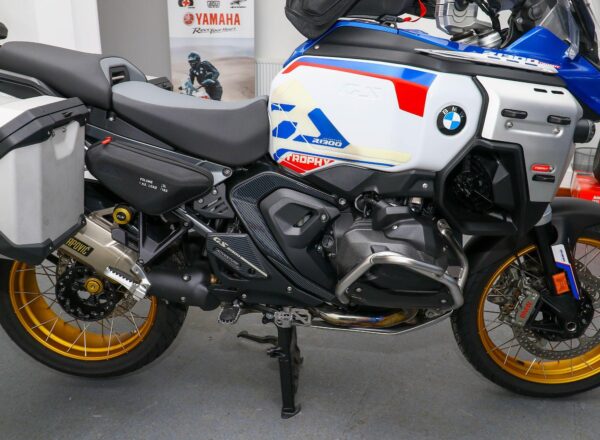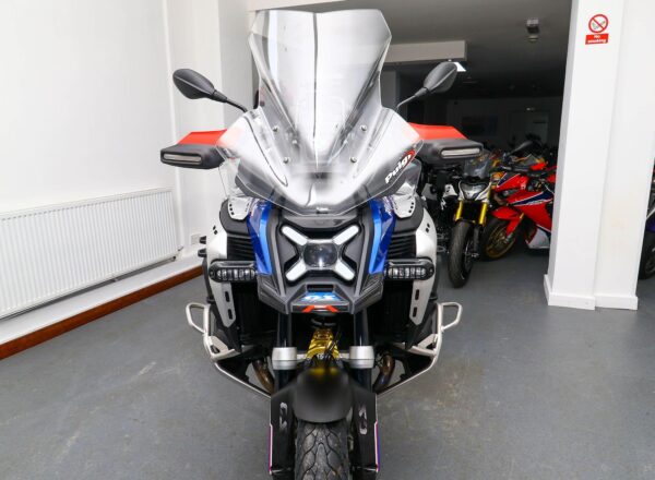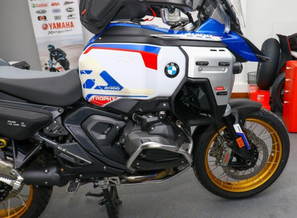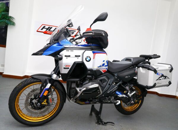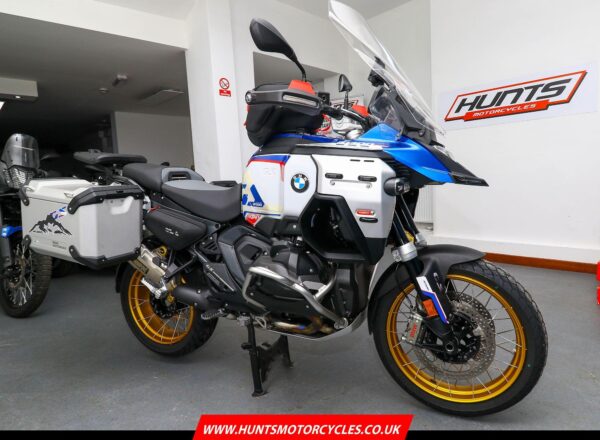 December 2024, ’74 reg. BMW R1300 GS Adventure TE ASA Trophy. One owner from new and complete with Touring and Dynamic packages, Automated Shift Assistant, deluxe headlight, riding modes, sport brake, M lightweight battery, electrically adjustable windscreen, mainstand, BMW teleservices, heated rider and passenger comfort seats, gold anodised wheels plus front fender extender, full size hugger guard, BMW side panel bags and tank bag, genuine BMW panniers, side stand enlarger, Puig touring windscreen (standard screen included), plus full colour match paint protection kit. Recent new tyres fitted. BMW second 9K service carried out 40 miles ago. Beautifully looked after and complete with balance of BMW warranty. Superb value at £19,995. PLUS : WE’LL DELIVER TO YOUR DOOR ANYWHERE IN MAINLAND UK FOR JUST £99! – Part-Ex and finance/PCP available, please ask for details. Call Hunts Motorcycles on 0161-432 1303. Please note: Some of our stock is stored off-site so please call us before setting off to view any of our pre-owned bikes.