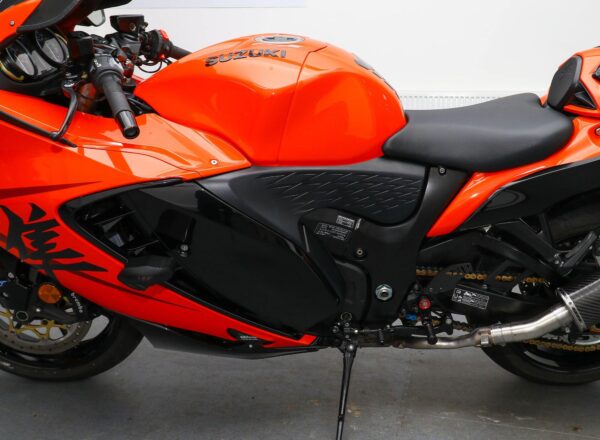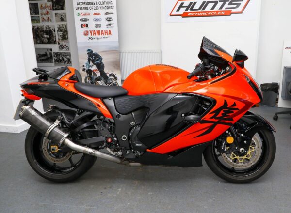 2025 Suzuki GSX1300R Hayabusa 25th Anniversary Edition. One owner and JUST 2,766 MILES from new. Finished in stunning Glass Blaze Orange and Glass Sparkle Black colour combination and complete with 25th-Anniversary enamel fuel tank emblem, Gold anodised brake disc carriers and chain adjusters, seat cowl with pillion seat, tinted windscreen, Suzuki fairing protectors, GB Racing engine case covers, tail tidy, heated grips and Max Torque exhaust cans (standard pipes included). Reg. number BU58 NOB included. Balance of Suzuki warranty. Looks, sounds and rides superb. £14,795. PLUS : WE’LL DELIVER TO YOUR DOOR ANYWHERE IN MAINLAND UK FOR JUST £99! – Part-Ex and finance/PCP available, please ask for details. Call Hunts Motorcycles on 0161-432 1303. Please note: Some of our stock is stored off-site so please call us before setting off to view any of our pre-owned bikes.